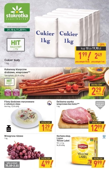 Nowa gazetka promocyjna sieci sklepów Stokrotka. Polecane promocje z gazetki Stokrotka: Cukier biały 10x1 kg - 19,90 zł. Kabanosy Tarczyński 100 g - 2,29 zł. Filety śledziowe marynowane z cebulą w oleju Herring 100 g - 1,29…