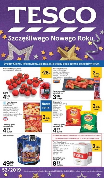Nowa gazetka promocyjna sieci sklepów Tesco. Polecane promocje z gazetki Tesco: Pomidory cherry na gronie 500 g - 4,99 zł. Kabanosy Tarczyński Exclusive 2x115 g - 7 zł. Bateria Cosmic - 49,99 zł. Oferta ważna od…