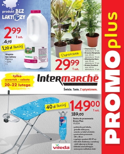 {loadposition linkIntermarche} 'Promo Plus' - nowa gazetka promocyjna sieci sklepów Intermarche Polecane promocje z gazetki Intermarche: Mleko Wiejskie bez laktozy Piątnica 1 L - 2,99 zł. Chamaedorea w doniczce - 29,99 zł. Deska do prasowania Vileda Bravo Plus -…