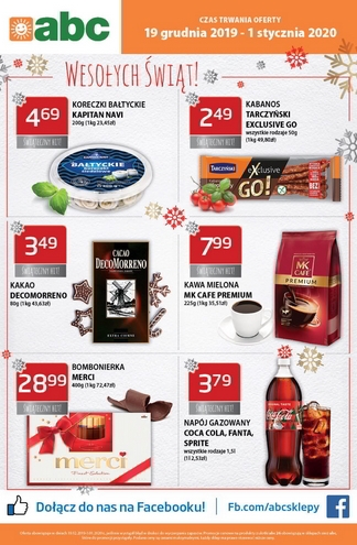 {loadposition linkABC} Nowa gazetka promocyjna sieci sklepów ABC. Polecane promocje z gazetki ABC: Koreczki bałtyckie Kapitan Navi 200 g - 4,69 zł. Margaryna Kruszwica 250 g - 2,49 zł. Kakao Decomoreno 80 g - 3,49 zł. …