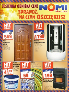 Nowa gazetka promocyjna Nomi - "Jesienna obniżka cen! Sprawdź na czym oszczędzisz". Polecane promocje z gazetki Nomi: Drzwi zewnętrzne MALTA - 569 zł. Kabina z hydromasażem - 1199 zł. Piecyk gazowy z reduktorem - 199 zł. Oferta…