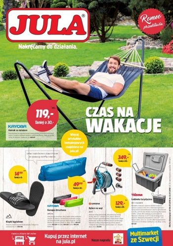 {loadposition linkJula} 'Czas na wakacje' - nowa gazetka promocyjna sieci handlowej Jula. Polecane promocje z gazetki Jula: Hamak ze stelażem Kayoba - 119 zł. Klapki kąpielowe BLWR - 14,99 zł. Kanapa dmuchana Kayoba - 49,99 zł. Oferta…