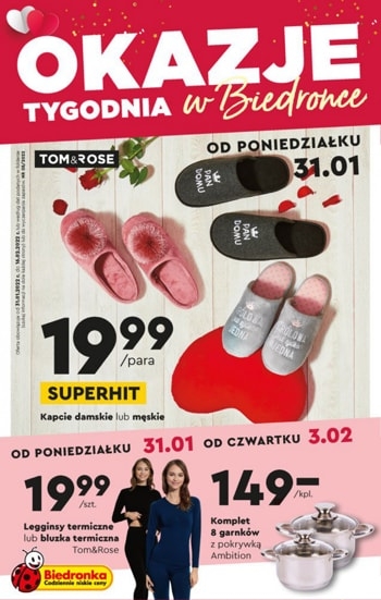 {loadposition linkBiedronka} 'Okazje tygodnia' - nowa gazetka promocyjna sieci sklepów Biedronka. Polecane promocje z gazetki sieci Biedronka: Kapcie damskie lub męskie - 19,99 zł. Legginsy termiczne Tom&Rose - 19,99 zł. Komplet 8 garnków z pokrywką Ambition - 149 zł.…