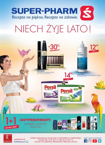 Nowa gazetka promocyjna Super-Pharm - "Niech żyje lato!". Polecane promocje z gazetki Super-Pharm: Płyn do soczewek kontaktowych Lensvision 360 ml - 12,99 zł. Kapsułki do prania Persil Duo-Caps 15 sztuk - 14,99 zł. Żel pod prysznic Nivea Men…