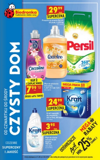 {loadposition linkBiedronka} 'Czysty dom' - nowa gazetka promocyjna sieci sklepów Biedronka. Polecane promocje z gazetki sieci Biedronka: Płyn do płukania Coccolino 2x1,5 L - 15,98 zł. Kapsułki do zmywarki Kraft All in One 68 kapsułek - 24,99 zł.…