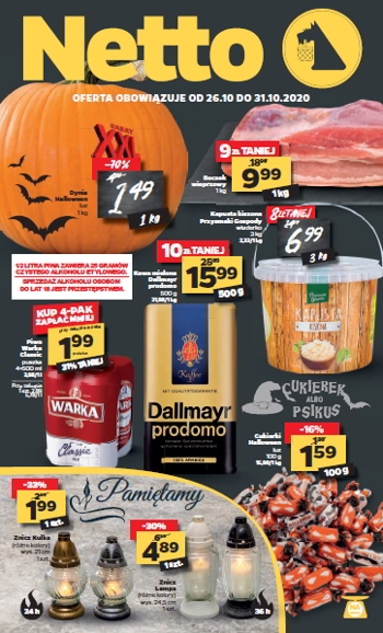 Nowa gazetka promocyjna sieci sklepów Netto. Polecane promocje z gazetki Netto: Dynia Halloween 1 kg - 1,49 zł. Boczek wieprzowy 1 kg - 9,99 zł. Kapusta kiszona Przysmaki Gospody 3 kg - 6,99 zł. Oferta ważna od…