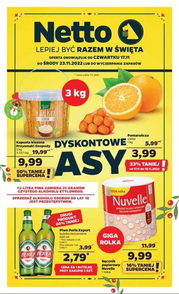 'Bezcenne święta dla wszystkich' - nowa gazetka promocyjna sieci sklepów Netto. Polecane promocje z gazetki Netto: Jabłka 1 kg - 1,99 zł. Łopatka wieprzowa 1 kg - 8,99 zł. Kapusta kiszona Przysmaki Gospody 3 kg - 6,99 zł. …