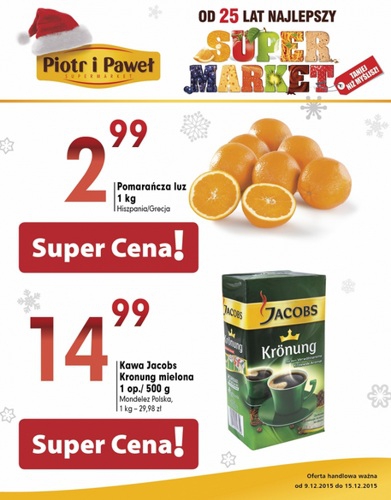 Nowa gazetka promocyjna sieci sklepów Piotr i Paweł - "Super cena!". Polecane promocje z gazetki Piotr i Paweł: Pomarańcze 1 kg - 2,99 zł. Kawa mielona Jacobs Kronung 500 g - 14,99 zł. Kapusta kwaszona 3 kg -…