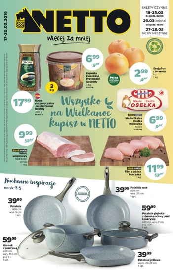 {loadposition linkNetto} Nowa gazetka promocyjna Netto - "Wszystko na Wielkanoc kupisz w Netto". Polecane promocje z gazetki Netto: Schab wieprzowy bez kości 1 kg - 9,99 zł. Filet z udźca kurczaka 1 kg - 11,99 zł. Kapusta kwaszona…