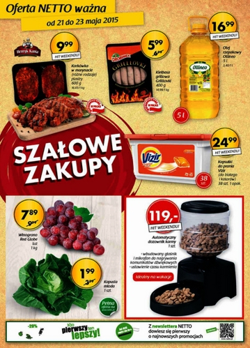 {loadposition linkNetto} Nowa gazetka promocyjna Netto - "Szałowe zakupy". Polecane promocje z gazetki Netto: Automatyczny dozownik karmy - 119 zł. Kapusta młoda 1 sztuka - 1,99 zł. Kapsułki do prania Vizir 38 sztuk - 24,99 zł. Oferta…