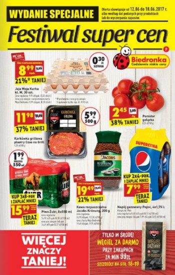 {loadposition linkBiedronka2} 'Wielkie kibicowanie od czwartku do środy' - nowa gazetka promocyjna sieci sklepów Biedronka. Polecane promocje z gazetki sieci Biedronka: Pomidory malinowe polskie układane 1 kg - 4,75 zł. Karkówka grillowa w plastrach Czas na grill 1 kg…