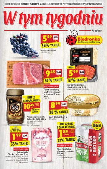 {loadposition linkBiedronka} Nowa gazetka promocyjna sieci handlowej Biedronka - "W tym tygodniu". Polecane promocje z gazetki sieci Biedronka: Winogrono ciemne 1 kg - 5,49 zł. Karkówka grillowa plastry Czas na grill 500 g - 5,99 zł. Lody…