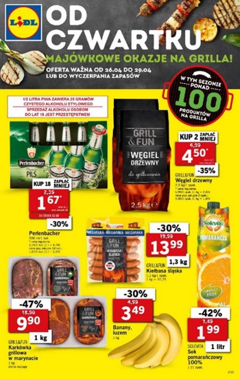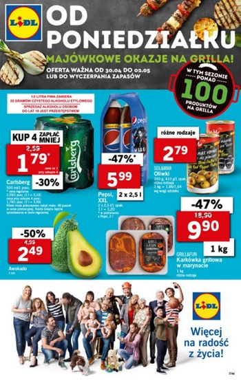 {loadposition linkLidl1} 'Od poniedziałku majówkowe okazje na grilla!' - nowa gazetka promocyjna sieci sklepów Lidl. Polecane promocje z gazetki sklepów Lidl: Piwo Carlsberg 4x500 ml - 7,16 zł. Awokado 1 sztuka - 2,49 zł. Karkówka grillowa w…