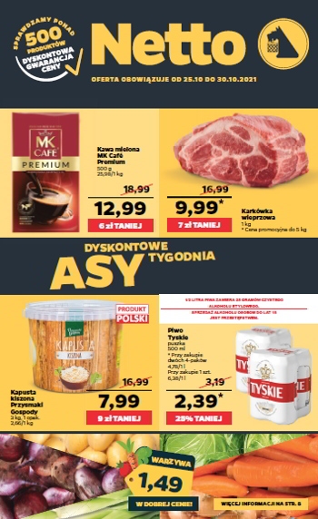 {loadposition linkNetto} 'Dyskontowe asy tygodnia' - nowa gazetka promocyjna sieci sklepów Netto. Polecane promocje z gazetki Netto: Kawa mielona MK Cafe Premium 500 g - 12,99 zł. Karkówka wieprzowa 1 kg - 9,99 zł. Kapusta kiszona Przysmaki Gospody 3…