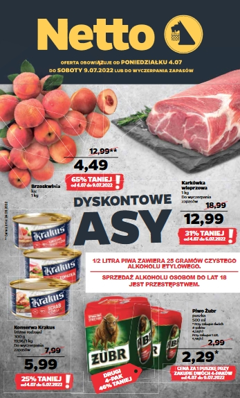 {loadposition linkNetto3} 'Dyskontowe asy' - nowa gazetka promocyjna sieci sklepów Netto. Polecane promocje z gazetki Netto: Brzoskwinie 1 kg - 4,49 zł. Karkówka wieprzowa 1 kg - 12,99 zł*. Konserwa Krakus 300 g - 5,99 zł**. * -…