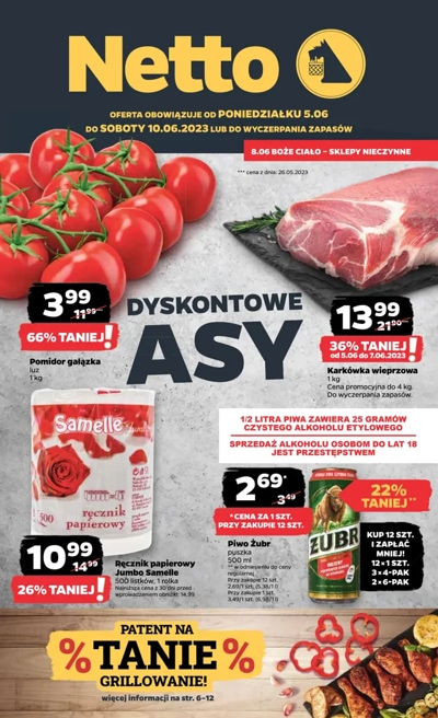 {loadposition linkNetto} 'Dyskontowe asy' - nowa gazetka promocyjna sieci sklepów Netto. Polecane promocje z gazetki Netto: Pomidory gałązka 1 kg - 3,99 zł. Karkówka wieprzowa 1 kg - 13,99 zł*. Ręcznik papierowy Jumbo Samelle 1 rolka - 10,99 zł.…