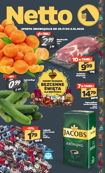 'Bezcenne święta dla wszystkich' - nowa gazetka promocyjna sieci sklepów Netto. Polecane promocje z gazetki Netto: Mandarynki 1 kg - 2,99 zł. Karkówka wieprzowa 1 kg - 9,99 zł. Ogórek długi 1 sztuka - 0,99 zł. Oferta…