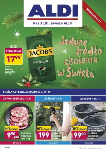 {loadposition linkAldi} 'Jedyne źródło ciśnienia w Święta' - nowa gazetka promocyjna sieci sklepów Aldi. Polecane promocje z gazetki Aldi: Kawa mielona Jacobs Kronung 500 g - 17,99 zł. Karkówka wieprzowa 1 kg - 9,90 zł. Elektryczna myjka do okien…