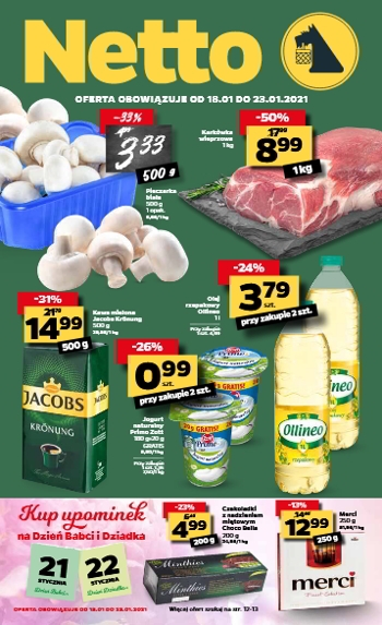 Nowa gazetka promocyjna sieci sklepów Netto. Polecane promocje z gazetki Netto: Pieczarka biała 500 g - 3,33 zł. Karkówka wieprzowa 1 kg - 8,99 zł. Kawa mielona Jacobs Kronung 500 g - 14,99 zł. Oferta ważna od…