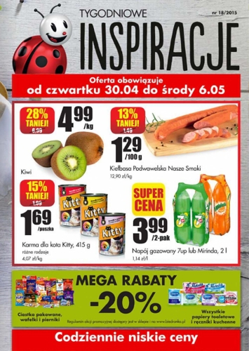 {loadposition linkBiedronka} Nowa gazetka promocyjna sieci handlowej Biedronka - "Inspiracje tygodniowe". Polecane promocje z gazetki sieci Biedronka: Kiwi 1 kg - 4,99 zł. Kiełbasa podwawelska Nasze Smaki 100 g - 1,29 zł. Karma dla kota Kitty 415 g -…