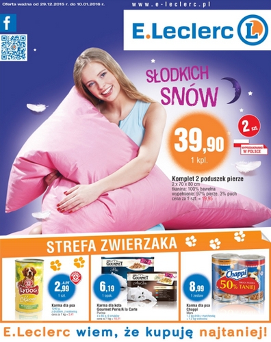 {loadposition linkEleclerc} Nowa gazetka promocyjna sieci handlowej E.Leclerc - "Powitajmy Nowy Rok 2016". Polecane promocje z gazetki E.Leclerc: Komplet 2 poduszek z pierza - 39,90 zł. Karma dla psa Lydog 1240 g - 2,99 zł. Karma dla kota Purina…