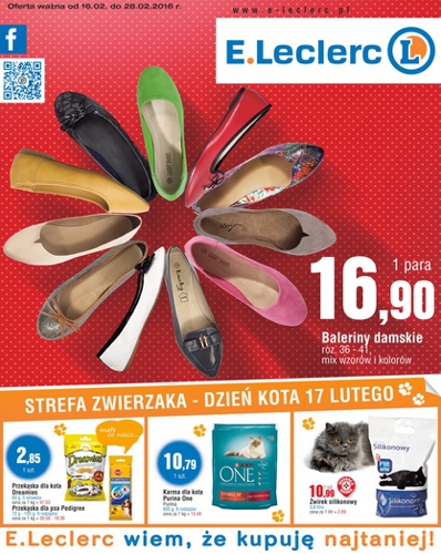 {loadposition linkEleclerc} Nowa gazetka promocyjna sieci handlowej E.Leclerc. Polecane promocje z gazetki E.Leclerc: Baleriny damskie - 16,90 zł. Karma dla kota Purina One 800 g - 10,79 zł. Żwirek silikonowy 3,8 L - 10,99 zł. Oferta ważna od…