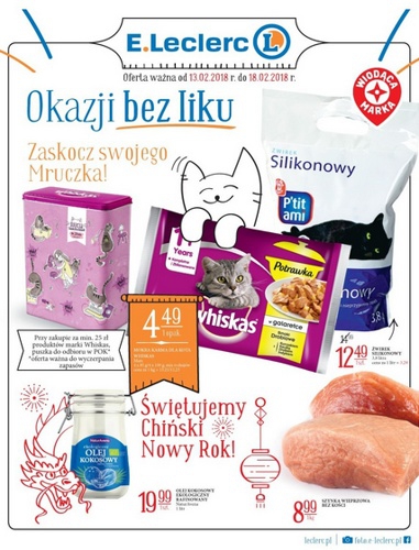 {loadposition linkEleclerc} 'Okazji bez liku. Zaskocz swojego Mruczka!' - nowa gazetka promocyjna sieci handlowej E.Leclerc. Polecane promocje z gazetki E.Leclerc: Mokra karma dla kota Whiskas mix rodzajów - 4,49 zł. Żwirek silikonowy 3,8 L - 12,49 zł. Olej kokosowy…