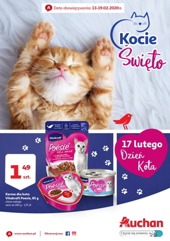 {loadposition linkAuchan} 'Kocie święto' - nowa gazetka promocyjna sieci marketów Auchan. Polecane promocje z gazetki Auchan: Karma dla kota Vitakraft Poesie 85 g - 1,49 zł. Mokra karma dla kota Auchan 415 g - 1,49 zł. Bezglutenowa karma mokra…