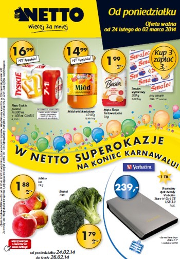 {loadposition linkNetto} Nowa gazetka promocyjna Netto - "W netto superokazje na koniec karnawału!". Polecane promocje z gazetki Netto: Piwo Tyskie 500 ml 8 sztuk - 16,99 zł. Karma sucha Bobik dla psa 5 kg - 9,99 zł. Przenośny…