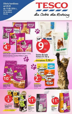 Nowa ulotka Tesco. Polecane promocje z ulotki Tesco: Karma dla kota w saszetkach Whiskas - 4,39 zł. Karma dla kota Perfect Fit 750 g - 9,99 zł. Karma dla psa Friskies Purina 12 kg - 51,99 zł. …