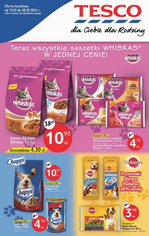 Nowa ulotka Tesco - "Wszystko dla pupila. Polecane promocje z ulotki Tesco: Karma dla kota Whiskas 1,5 kg - 10,99 zł. Karma dla psa Chappi 3 kg - 10,99 zł. Karma dla kota Purina One 800 g -…