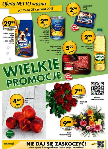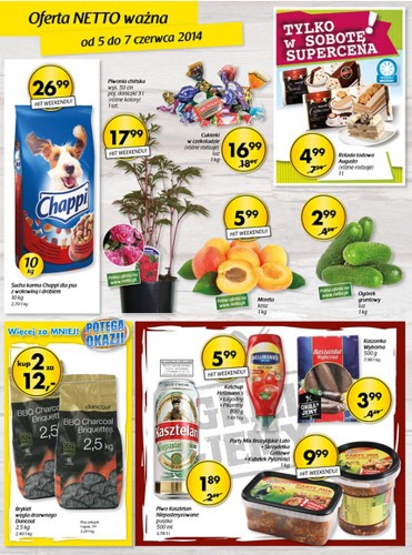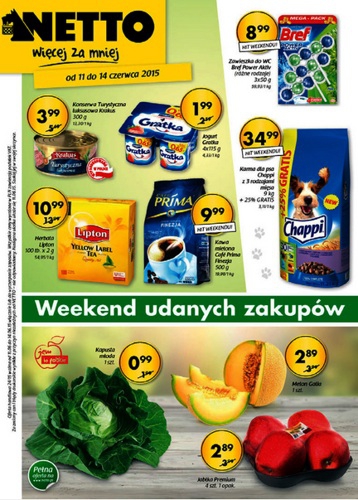 {loadposition linkNetto} Nowa gazetka promocyjna Netto - "Weekend udanych zakupów". Polecane promocje z gazetki Netto: Kapusta młoda 1 sztuka - 0,99 zł. Melon Galia 1 sztuka - 2,89 zł. Karma dla psa Chappi 9 kg - 34,99 zł.…