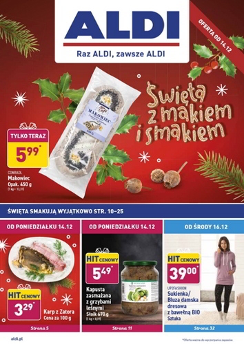 {loadposition linkAldi} 'Święta z makiem i smakiem' - nowa gazetka promocyjna sieci sklepów Aldi. Polecane promocje z gazetki Aldi: Makowiec Conradl 450 g - 5,99 zł. Karp z Zatora 100 g - 3,29 zł. Kapusta zasmażana z grzybami leśnymi…