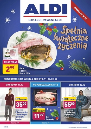 {loadposition linkAldi2} 'Aldi spełnia świąteczne życzenia' - nowa gazetka promocyjna sieci sklepów Aldi. Polecane promocje z gazetki Aldi: Karp z Zatora 100 g - 2,99 zł. Gęś 1 kg - 11,99 zł. Piżama męska z flanelowymi spodniami Enrico Mori…