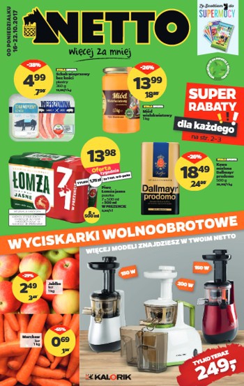 {loadposition linkNetto} Nowa gazetka promocyjna sieci sklepów Netto. Polecane promocje z gazetki Netto: Wyciskarka wolnoobrotowa Kalorik - 249 zł. Miód wielokwiatowy 1 kg - 13,99 zł. Kawa mielona Dallmayr Prodomo 500 g - 18,49 zł. Oferta…
