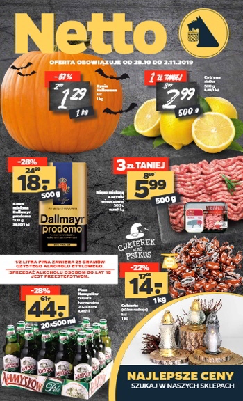 Nowa gazetka promocyjna sieci sklepów Netto. Polecane promocje z gazetki Netto: Dynia Halloween 1 kg - 1,29 zł. Cytryny siatka 500 g - 2,99 zł. Kawa mielona Dallmayr Prodomo 500 g - 18 zł. Oferta…