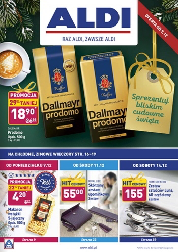 {loadposition linkAldi} 'Sprezentuj bliskim cudowne święta' - nowa gazetka promocyjna Aldi. Polecane promocje z gazetki Aldi: Kawa mielona Dallmayr Prodomo 500 g - 18,90 zł. Skórzany zestaw upominkowy Royal Life - 55 zł. Zestaw sztućców Luna 60 elementów -155…