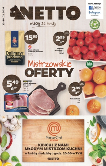 {loadposition linkNetto} Nowa gazetka promocyjna Netto - "Mistrzowskie oferty". Polecane promocje z gazetki Netto: Kawa mielona Dallmayr prodomo 500 g - 15,99 zł. Pomidory gruszkowe 500 g - 2,99 zł. Pomarańcze 1 kg - 2,99 zł. Oferta…