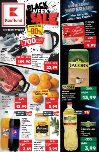 'Gwiezdny superłup. Moc korzyści przez cały tydzień' - nowa gazetka promocyjna sieci marketów Kaufland. Polecane promocje z gazetki Kaufland: Czajnik elektryczny Esperanza - 22,99 zł. Kawa mielona Jacobs Cronat Gold - 13,99 zł. Olej rzepakowy Wielkopolski 1 L…