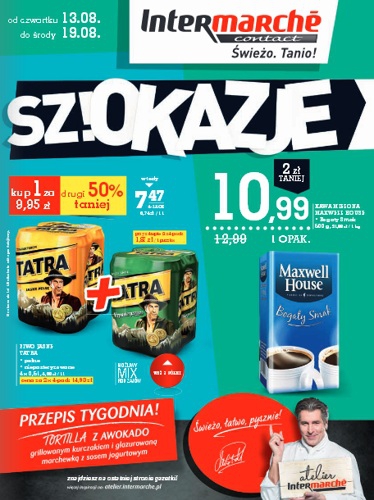 {loadposition linkIntermarche} Nowa gazetka promocyjna sieci handlowej Intermarche - "Sz!Okazje". Polecane promocje z gazetki Intermarche: Piwo Tatra 8x500 ml - 14,93 zł. Kawa mielona Maxwell House 500 g - 10,99 zł. Olej Kujawski 3 L - 12,95 zł. …