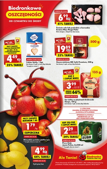 {loadposition linkBiedronka2} 'Biedronkowe oszczędności od czwartku do środy' - nowa gazetka promocyjna sieci sklepów Biedronka. Polecane promocje z gazetki sieci Biedronka: Cukier biały 1 kg - 4,49 zł*. Kawa mielona MK Cafe Premium 500 g - 19,89 zł**. Wszystkie…