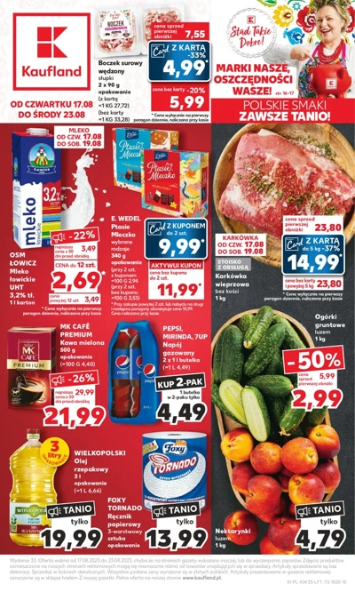 {loadposition linkKaufland5} 'Polskie smaki zawsze tanio' - nowa gazetka promocyjna sieci marketów Kaufland. Polecane promocje z gazetki Kaufland: Boczek surowy wędzony słupki 2x90 g - 4,99 zł*. Mleko Łowickie OSM Łowicz 1 L - 2,69 zł**. Kawa mielona MK…