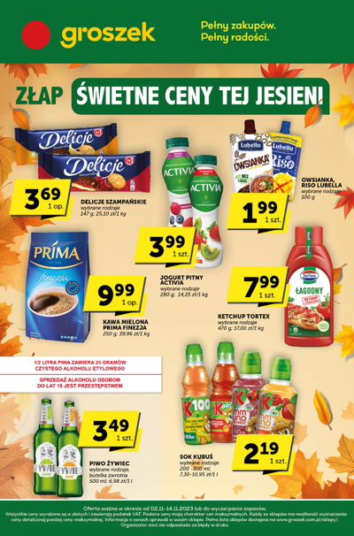 {loadposition linkGroszek} 'Złap świetne ceny tej jesieni' - nowa gazetka promocyjna sieci sklepów Groszek. Polecane promocje z gazetki Groszek: Delicje Szampańskie 147 g - 3,69 zł. Jogurt Ale Activia 280 g - 3,99 zł. Kawa mielona Prima Finezja 250…
