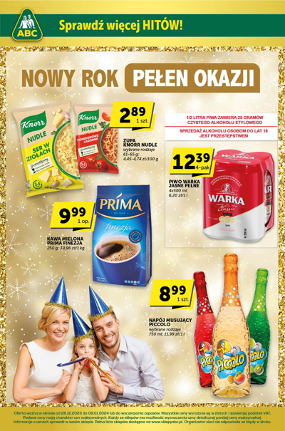 {loadposition linkABC} 'Nowy Rok pełen okazji' - nowa gazetka promocyjna sieci sklepów ABC. Polecane promocje z gazetki ABC: Zupa Knorr Nudle wybrane rodzaje - 2,89 zł. Kawa mielona Prima Finezja 250 g - 9,99 zł. Napój musujący Piccolo 750…