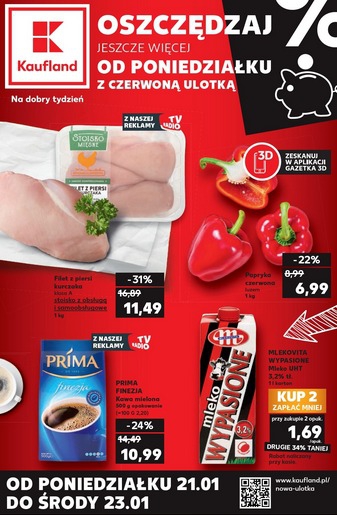 {loadposition linkKaufland} 'Oszczędzaj od początku tygodnia z czerwoną ulotką' - nowa gazetka promocyjna sieci marketów Kaufland. Polecane promocje z gazetki Kaufland: Filet z piersi kurczaka 1 kg - 11,49 zł. Papryka czerwona 1 kg - 6,99 zł.…