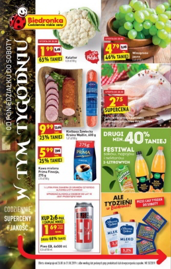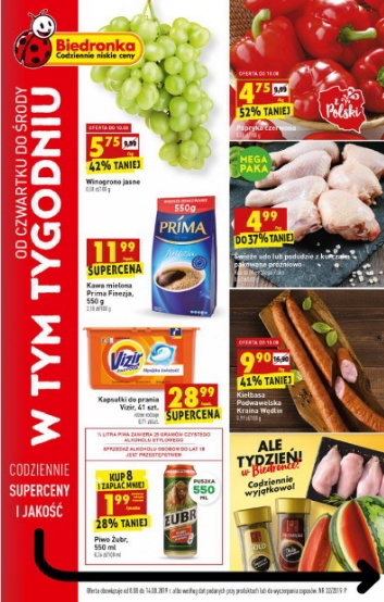 'W tym tygodniu' - nowa gazetka promocyjna sieci sklepów Biedronka. Polecane promocje z gazetki sieci Biedronka: Kalafior 1 kg - 1,99 zł. Świeża ćwiartka z kurczaka pakowana próżniowo Kraina Mięs 1 kg - 2,75 zł. Kawa mielona…