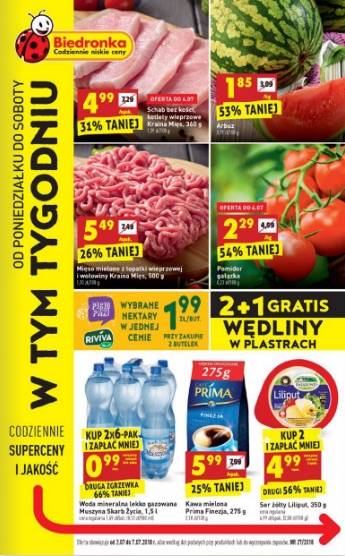 {loadposition linkBiedronka1} 'W tym tygodniu' - nowa gazetka promocyjna sieci sklepów Biedronka. Polecane promocje z gazetki sieci Biedronka: Arbuz 1 kg - 1,85 zł. Pomidory gałązka 1 kg - 2,29 zł. Kawa mielona Prima Finezja 275 g…