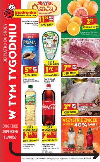 {loadposition linkBiedronka2} 'W tym tygodniu' - nowa gazetka promocyjna sieci sklepów Biedronka. Polecane promocje z gazetki sieci Biedronka: Kawa mielona Prima Finezja 275 g - 5,99 zł. Sok pomarańczowy Riviva 1 L - 1,99 zł. Pomarańcze deserowe…