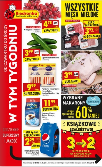 {loadposition linkBiedronka2} 'W tym tygodniu' - nowa gazetka promocyjna sieci sklepów Biedronka. Polecane promocje z gazetki sieci Biedronka: Winogrono różowe 1 kg - 4,75 zł. Ogórki szklarniowe 1 kg - 3,99 zł. Kawa mielona Prima Finezja…