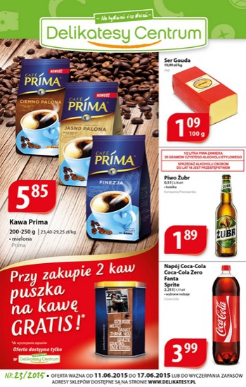 {loadposition linkDelikatesyCentrum} Nowa gazetka promocyjna Delikatesów Centrum. Polecane promocje z gazetki Delikatesów Centrum: Kawa mielona Prima 250 g - 5,85 zł. Szynka konserwowa 1 kg - 13,99 zł. Napój Caprio 2 L - 2,99 zł. Oferta ważna od…
